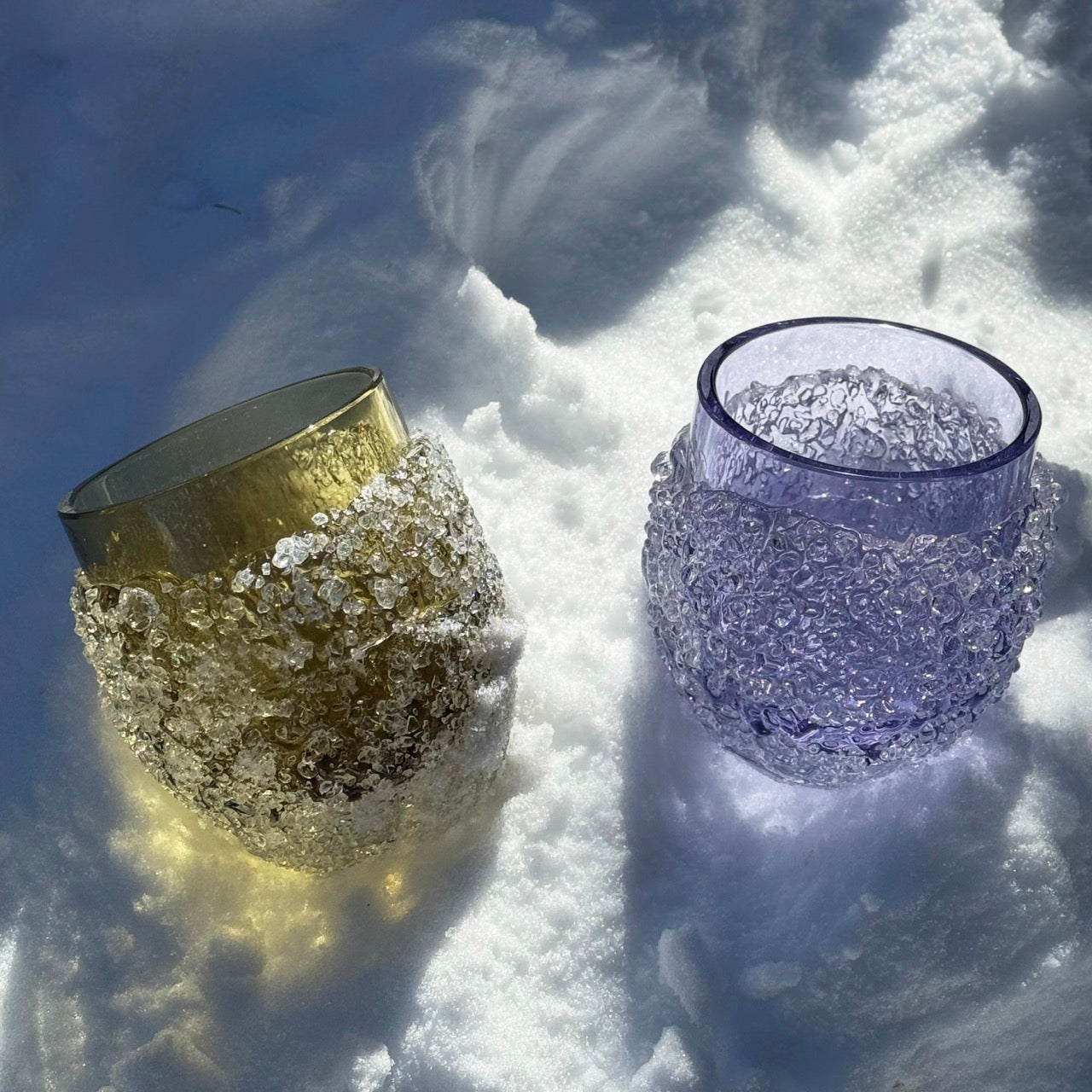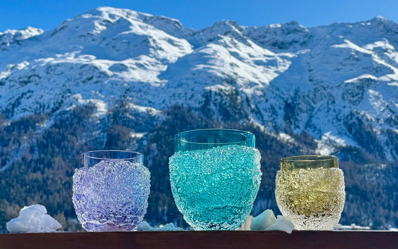 This winter we brought our Ghiaccio vases and glasses from the heat of the furnace to the mountain snow. Each piece is born in the fire: while the glass is still incandescent, small clear glass fragments fuse onto the hot surface, creating an irregular and luminous texture. On fresh snow, this surface reflects the light like crushed ice. The contrast between fire and frost highlights its character and material strength.