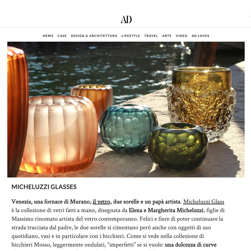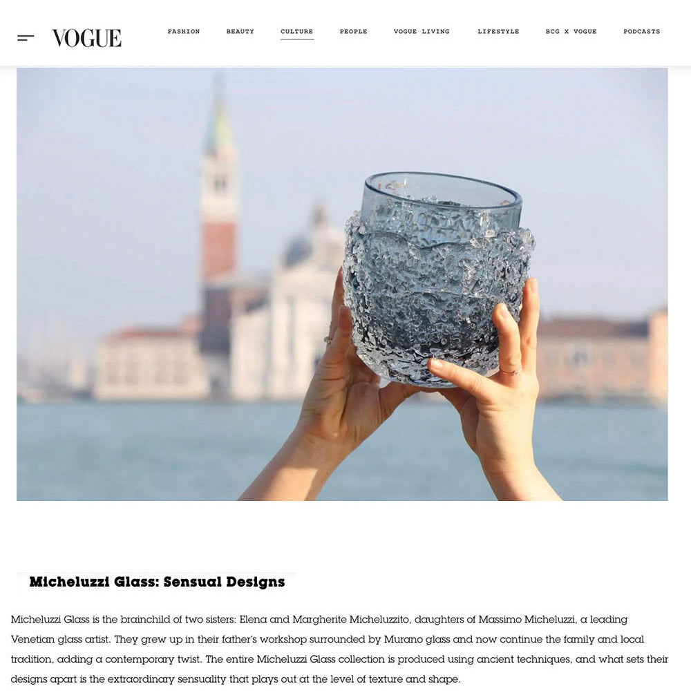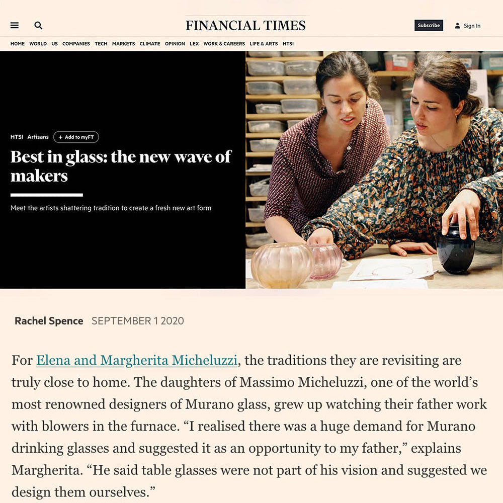 Micheluzzi Glass ha fatto parlare di sé anche fuori dall’Italia, conquistando l’attenzione di alcune tra le riviste più conosciute al mondo. Il nostro mix speciale di tradizione muranese e design moderno è stato raccontato da testate come Financial Times, Vogue, Architectural Digest, Elle e BBC Travel.