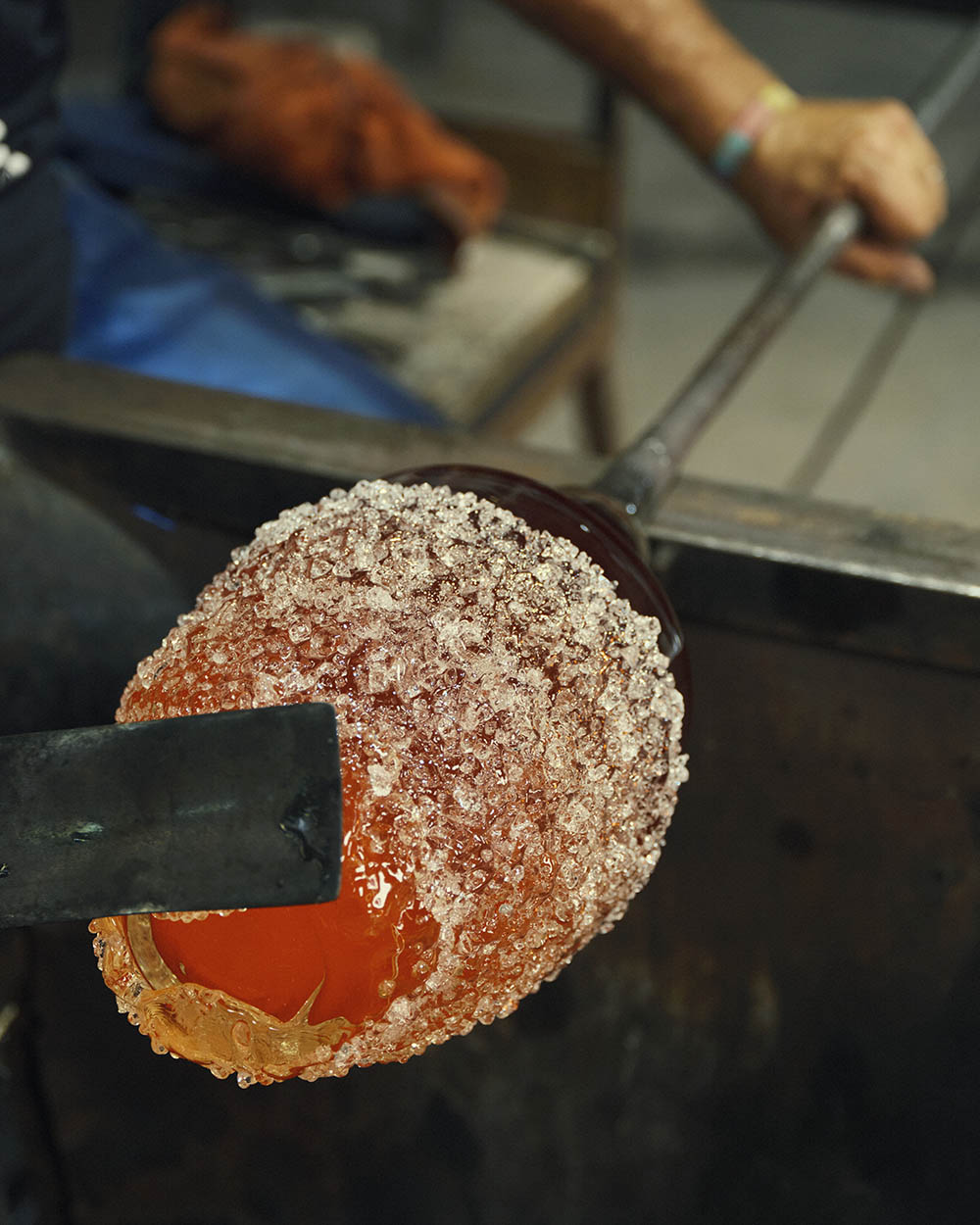 The making consists of rolling the incandescent glass upon a bed made of transparent glass flakes.